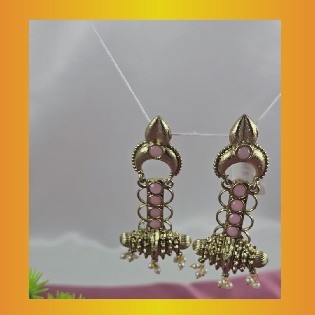 Amazing light pink stone drop CZ german pearl earring is made of brass alloy with gold plating. These studs are 1.8 inches long, and the lock is push back.