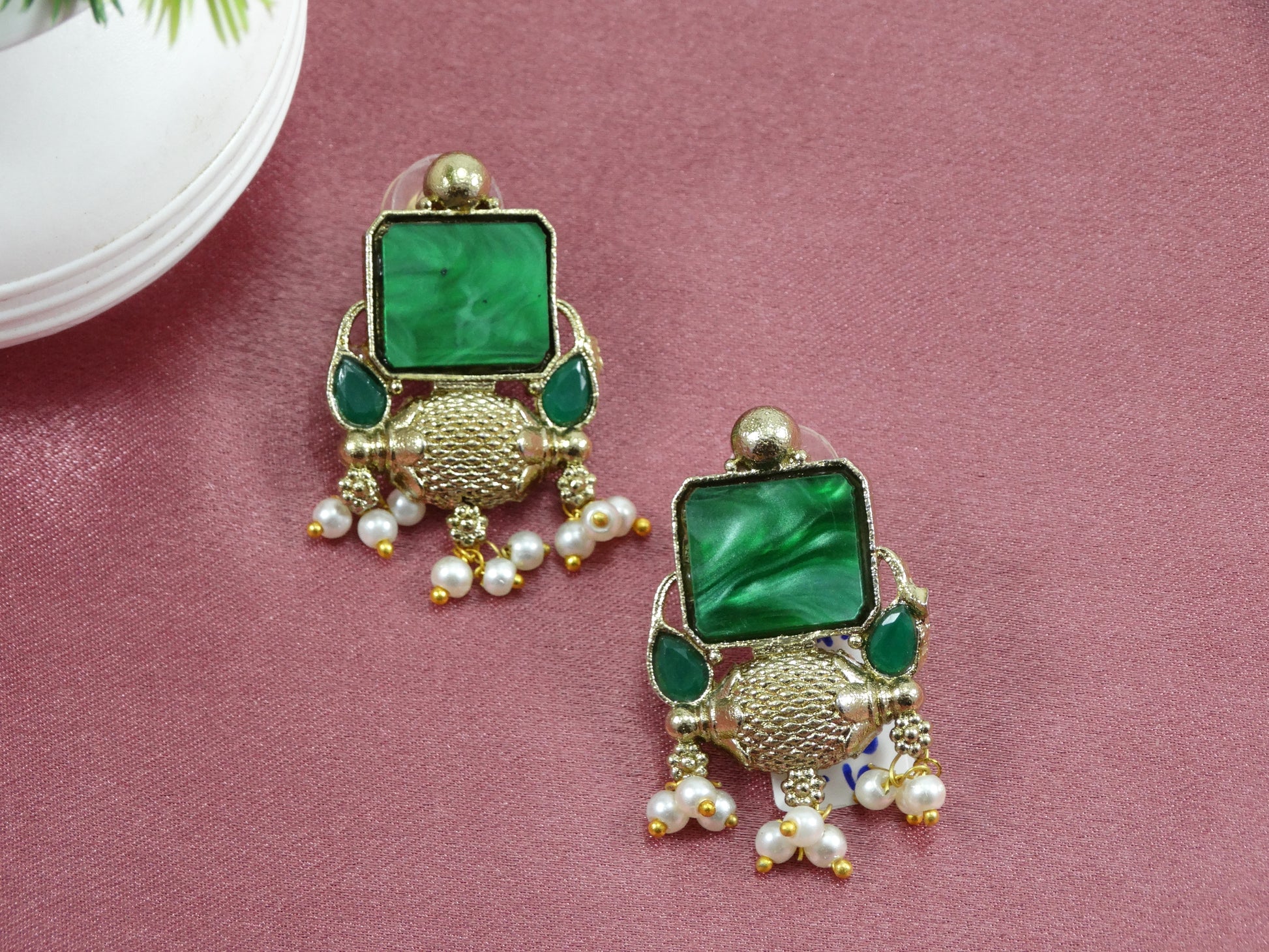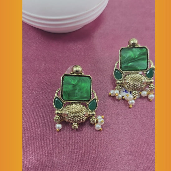 Amazing green stone drop CZ German pearl earring is made of brass alloy with gold plating. These studs are 1.8 inches long, and the lock is push back.