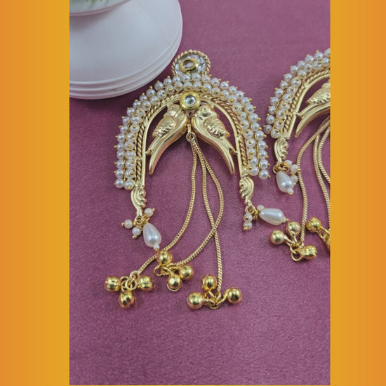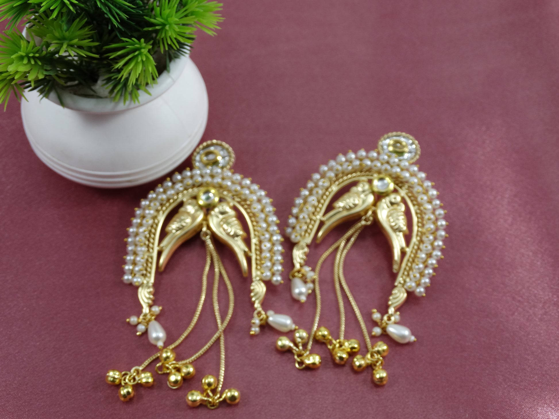 Amazing warm white pearl drop semi stone pearl earring is made of brass alloy with gold plating. These studs are 1.8 inches long, and the lock is push back.